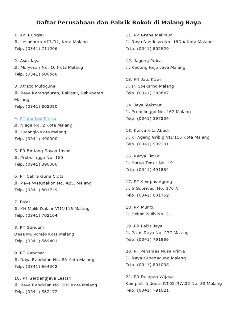 Minamas plantation po box 1377 pekanbaru. Bentoel internasional investama tbk (rmba) adalah anggota british american tobacco group. Peningkatan produktivitas di perusahaan rokok pt penamas nusa prima di kebonagung malang dengan metode . Lowongan kerja pt penamas malang / lowongan kerja pt penamas malang daftar perusahaan dan pabrik rokok di malang raya ngalam co : Lowongan kerja pt penamas malang :